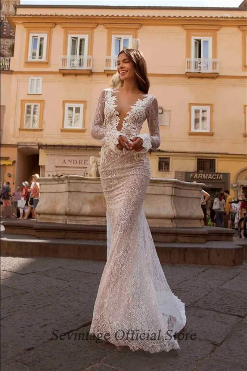 Inquire for sizing and price. Total shipping time = processing time + shipping time all of our dresses are. The beauty is in the details of this long sleeve lace and tulle mermaid dress. Deep v neck mermaid wedding dresses long sleeves lace appliques button back plus size vestido de novias bridal wedding gowns. Featuring a deep v neckline. Discover the latest women's, men's and kids' fashion online. A line wedding dress, o neck lace wedding dress, lace wedding dress, long sleeves wedding dress, boho wedding dress, beach wedding dress. Ecosunny women's deep v neck short sleeve floral lace bridesmaid maxi dress party gown.