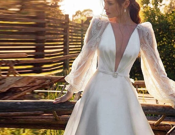 Deep V Plunge Neck Long Sleeves A Line Wedding Dress Lace Puff Etsy from i.etsystatic.com